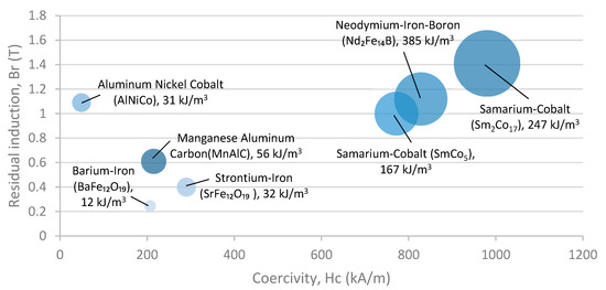 PMs have been crucial in developing technology and industry by providing consistent and reliable magnetic fields without needing an external power source. Due to their intrinsic properties, these magnets generate a persistent magnetic field, making them essential in various applications, from household items to advanced industrial equipment. Figure 2 illustrates the magnetic parameters of various PMs, highlighting key properties such as magnetization coercivity Hc,(kA/m), remanence Br(T), and maximum energy product BHmax(kJ/m3).