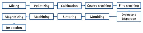 The production of ferrite magnets involves a series of well-defined steps that ensure the creation of materials with desirable magnetic properties (Figure 3). These steps include preparing raw materials, mixing, pre-sintering, sintering, and finishing processes. Each step is crucial in determining the final quality and performance of the ferrite magnets.