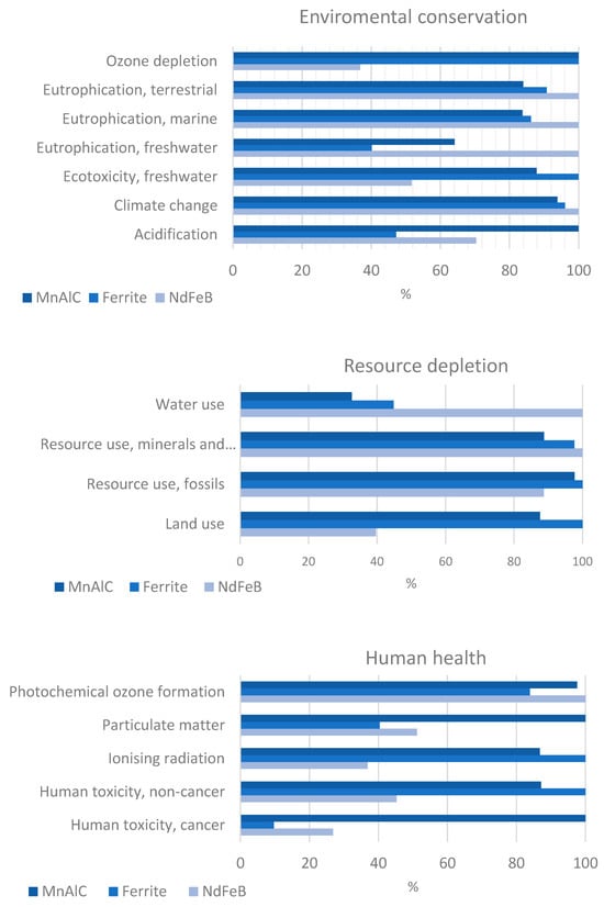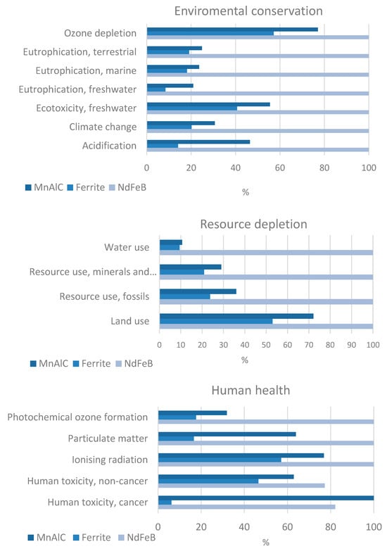 The results of the classification and characterization steps in the LCA allow us to assess the environmental impact associated with the production of NdFeB, ferrite, and MnAlC magnets across three key categories: environmental conservation, resource depletion, and human health. These assessments are based on a functional unit of 1 kg mass of product, as shown in Figure 5.