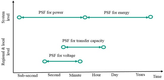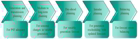 Due to the intermittent and unstable nature of VRES energy generation, successful production requires a sharp, steep slope and numerous starts. Coupled with variable loads, this penetration of VRES introduces operational and planning difficulties to the conventional units of the power system [37]. The power system variability plays its role stage by stage. In different stages, the variability requirement is different. For example, the net load variability does not significantly affect long-term resource planning and operation but plays a vital role in daily operation [40]. Some control mechanisms need to be employed for very short-term response intervals due to the instantaneous changes in the RES penetration. Low-voltage-ride-through (LVRT) [41], active and reactive power, operational voltage, and ramping slope [42] are some typical control strategies for very short-term response intervals. The response time scale has a significant impact on the operational PSF. For short-term time intervals (seconds to minutes), the frequency control and storage reservoir are enough to ensure PSF in the power system. In contrast, with a rapid ramping rate for a medium-term period (minutes to hours) and for a long-term time interval (hours to days), future planning flexibility is crucial (Figure 3) [34].