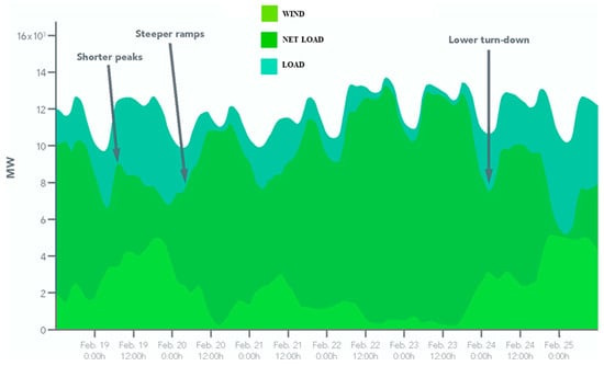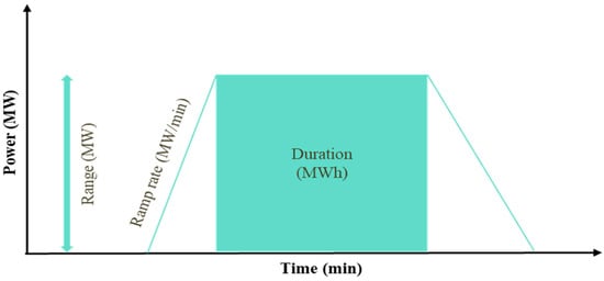 Due to the widespread insertion of VRES, maintaining PSF in contemporary power systems is a significant problem. Features like variability and the uncertainty of VRES provide different ramping patterns in the power system during transmission and distribution, which necessitates greater PSF inevitable [71]. Three key characteristics are used to describe PSF at the generation end: the output range of absolute power (MW), the ramping rate (MW/min), and the continuity of energy level (MWh) (Figure 5) [29]. The absolute output power range is the difference between installed power and the minimum amount of power needed to keep the power system stable while operating. The power system’s PSF grows as the output power range widens. The ramping rate, on the other hand, indicates how quickly the power system may vary its output within a specific amount of time; the higher the ramping rate, the more flexible the power system is. Energy level continuity relates to the power system’s operational duration without any disturbances.