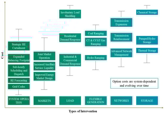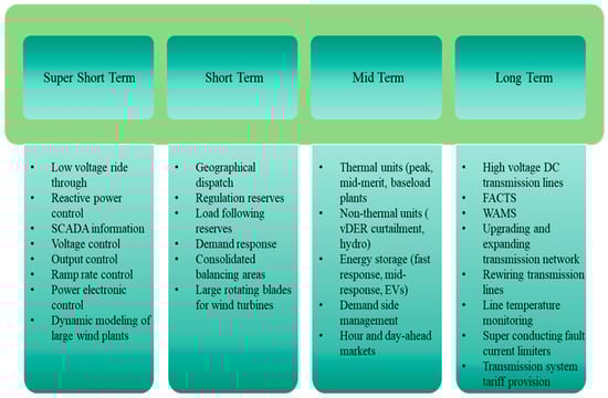 Sometimes, variability in renewables is instantaneous. In that case, some millisecond-range control systems, such as low-voltage-ride-through, frequency control, reactive power control, supervisory control through data procurement, voltage control, ramp rate control, power electronic control, and dynamic modeling of power plants, have been proposed and investigated to deal with these instantaneous variations on renewable generation [79]. The power system’s transient stability is the foremost important thing in the case of dynamic modeling. Smart and microgrid incorporation can fulfill super short-term flexibility requirements.