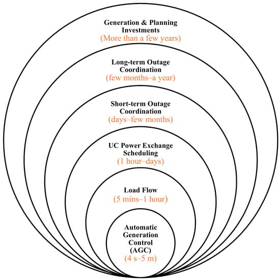 The widespread integration of renewable sources into power systems necessitates greater flexibility needs. The more renewable penetration needs more flexibility. It is reported that if the renewable penetration exceeds 30%, the flexibility requirement highly increases, especially for PV generation [76]. For scenarios of supply made entirely of renewable resources predicted for 2050, the generation (mixed with nominal capacity) must be twice as great as maximum demand [77]. A recent report by the Electric Reliability Council of Texas (ERCoT) reported that if the renewable penetration is more than 1 GW, the flexibility requirement needs to be recalibrated. A total of 14.5 GW penetration of PV in ERCoT necessitates a ramp increment by 135% of 1 h ramp rates and 30% in 3 h ramp requirements [78]. The utilization of renewable energy sources in power systems therefore results in increased degrees of flexibility needs. It is crucial to understand how the temporal impacts of renewable resources affect the flexibility of the power system in order to detect and fix flexibility problems. Time sequence effects are the effects’ durability in terms of flexibility. The penetration of renewable energy in flexibility requirements has four distinct time sequence effects: super short-term, short-term, mid-term, and long-term requirements (Figure 6).