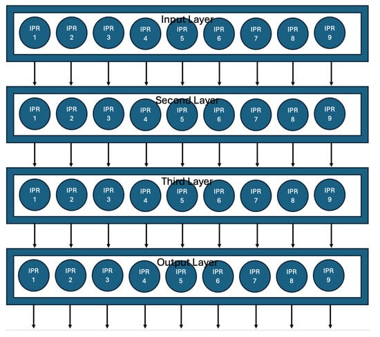 The proposed architecture is a PBN as defined by Shmulevich and Dougherty in [1], where each node represents an Intelligent Power Router used in every bus of the WSCC nine-bus test system, but with a multi-layered feed-forward structure where each layer is a PBN. Each node has a set of predictor functions that determine the next state of the node, based on the influence of the network’s previous state. All connections are fixed and based on the physical structure of each of the networks presented; they are intentionally connected as they follow each of their specific connection structures. This structural modification was carried out in PRISM, representing a feed-forward PBN that differed from the model presented in [9,10]. The network was composed of four layers: an input layer, two middle layers, and an output layer. Figure 4 illustrates the architecture of the solution.