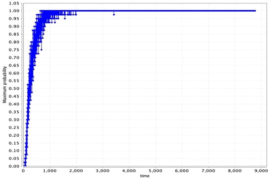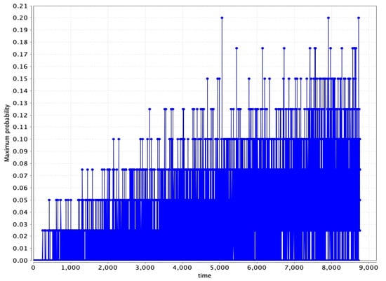 In Figure 6, the maximum probability of occurrence of a fault/failure is at its maximum at 638 h, with the probability reaching 100% at that time.
