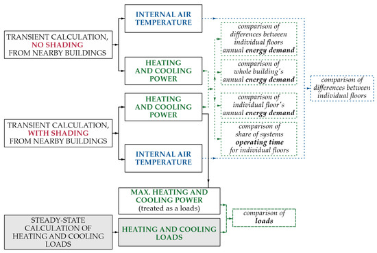 The analyses carried out according to the block chart (Figure 1) include comparison of the results of energy demand calculations in transient conditions with and without taking into account the shading from nearby buildings, supplemented by a shortened comparison of the results of the heating and cooling loads in transient conditions with steady-state calculation (without shading from nearby buildings).