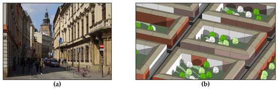 View of the streets of Kraków (reproduced from [47]) (a) and typical layout of Kraków’s buildings in its historic centre (b).