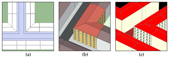 - A two-dimensional generic urban layout characteristic of Kraków’s development at the turn of the 20th century was prepared based on publicly available maps (Figure 3a).