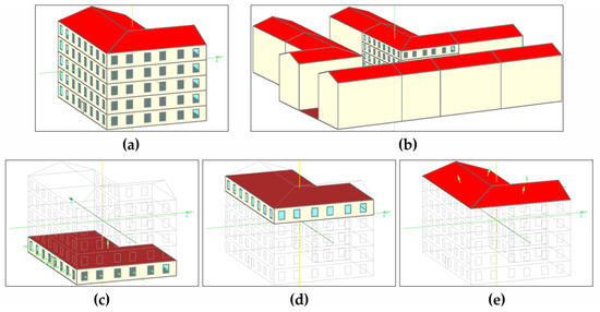 The building was divided into a total of seven simulation zones (Figure 4c–e). Each of the five floors was considered a separate zone: the five inhabited floors, unused attic. Adjacent buildings were combined into one zone. Each floor was divided into 5 apartments and a staircase. Internal partitions were included in the model as so-called non-visualized components. As a result, they affected the building’s accumulation capacity.