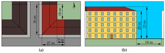 The final building model is presented in Figure 4. It should be noted that the building model was created in two variants. Variant 1 does not take into account the nearby buildings (Figure 4a), and therefore does not take into account the shading generated by these buildings. Variant 2 takes into consideration the nearby buildings (Figure 4b). The modelled building has 5 floors above ground with a room height of 3.7 m. Each floor has an area of 672 m2, which translates into a total building area of 3360 m2. The tenement house has an L-shape with dimensions of 27 × 36 m and its height is 23 m (Figure 5). The building is located in the south-western corner of the tenement house block, among other buildings of the same height.