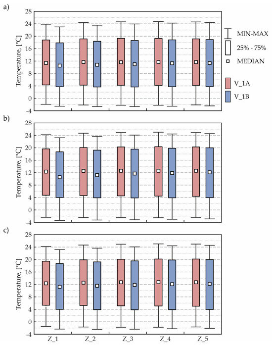 Depending on the building floor, for V_1A, the minimum temperatures for TMY_1 ranged from −2.1 °C to −1.9 °C, for TMY_2 from −2.5 °C to −2.4 °C, and for TMY_3 from −1.8 °C to −1.5 °C (Figure 9). After taking into account the shading from the nearby buildings (V_1B), these temperatures decreased even further: for TMY_1 it ranged from −2.7 °C to −2.4 °C, for TMY_2 from −3.4 °C to −2.9 °C, and for TMY_3 from −2.4 °C to −2.1 °C. For V_1A, the maximum temperatures for TMY_1 ranged from 23.9 °C to 24.7 °C, for TMY_2 and TMY_3 from 24.2 °C to 25.0 °C. For V_1B, similarly to V_1A, after taking into account shading, the temperatures decreased: for TMY_1 it ranged from 23.0 °C to 24.4 °C, and for TMY_2 and TMY_3 from 23.2 °C to 24.6 °C.