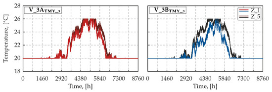 Internal temperature for Z_1 and Z_5 based on the calculations that take into account HVAC systems (heating and cooling), V_3A and V_3B for TMY_3.