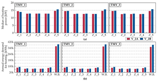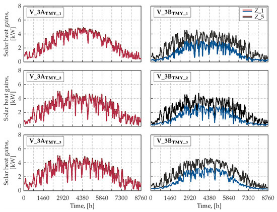 The medians of hourly solar heat gain values obtained for variant A were 5.1 kW for TMY_1, and 4.8 kW for TMY_2 and TMY_3. In the case of variant B, they differed depending on the zone: