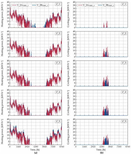 The maximum hourly energy demand values can be compared to the heating and cooling power. Design heat load is defined as the heat flow (power) required to achieve the specified internal design temperature under external design conditions. For the whole building, it is calculated from all transmission heat losses to the exterior and the ventilation heat loss of the building and with or without additional heating power. As a result of the calculations carried out (according to [11,12]), without taking into account the heating power, for the middle floor (Z_3) of the analysed building, a value of 38.3 kW was obtained. This means that in the case of steady-state calculations, 22–28% higher heating load (depending on TMY) values were obtained. It should be emphasized, however, that the calculations were performed at the currently applicable calculation temperature for winter, which is −20 °C for Kraków. In the case of calculations made assuming a designed outside temperature of −17 °C (minimum temperature for the assumed statistical climates) the heating load decreased to 35.4 kW. In this case, the heating load obtained was higher than for transient calculations by 13–18%.