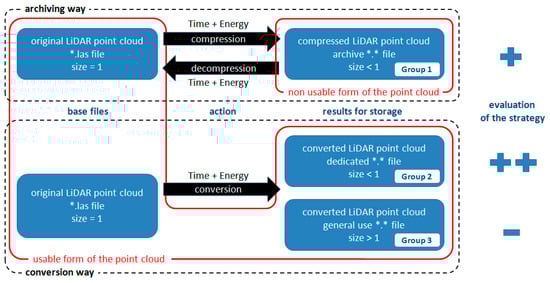Therefore, it would be far better to save/convert LiDAR data into formats that are dedicated to them, and their reduced size does not result in the need for additional steps before reuse. A key question, then, is which data handling strategy will be more effective: LiDAR domain-specific compression algorithms and formats (such as LAZ), or general-purpose compression algorithms (such as ZIP or RAR).