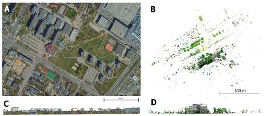 The ALS point cloud has an extent of approximately 800 × 500 m, which, with 15,885,170 points, gives approximately 39.7 pts/sq m. The TLS cloud at approximately 280 × 265 m, with the number of points, 23,998,971, gives approximately 320 pts/sq m. Obviously, due to the data acquisition perspective, these clouds differ from each other in terms of both density and uniformity. A summary of such differences using TLS and MLS clouds as an example is presented in the paper [78]. In this case, ALS clouds, which are sparser but more uniform, are contrasted with TLS clouds, which are heavily saturated with points in close proximity to the scanner, while single points are found at the boundaries of the file range. The above characteristics can be seen very well in Figure 2A,B.