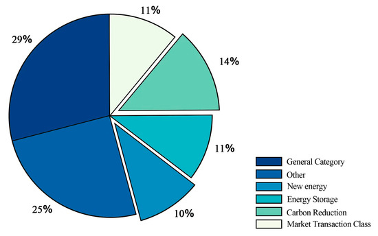 Since 2023, the national and local governments in China have introduced more than 700 energy-related policies. These involve energy strategic planning, the introduction of energy low-carbon transition programs, and so on [13]. Among them are 172 national policies, with the new energy category accounting for 10.47% and the dual carbon category accounting for 13.95%. The specific distribution of energy policy types in China is shown in Figure 1. For example, on 16 July 2023, the National Development and Reform Commission (NDRC) and the National Energy Administration (NEA) issued the Notice on the Responsible Weights of Renewable Energy Electricity Consumption and Related Matters in 2023, which specifies that the responsible weights of renewable energy electricity consumption in 2023 will be a binding indicator, and that provinces (autonomous regions and municipalities directly under the Central Government) will be assessed and evaluated according to this indicator. In the field of construction, 16 provinces (municipalities) have introduced carbon peak programs in urban and rural construction. They have respectively put forward development goals for the Fourteenth and Fifteenth Five-Year Plans, as well as key development plans, to accelerate the transformation of urban and rural construction methods and to improve the capacity for green and low-carbon development [14,15].