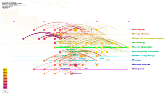 To understand the research trends of residential building energy systems in the past ten years, 1678 papers in the Web of Science database were searched and screened (time range: 2013 to 2023) using the term “residential building energy system optimization”. Through cluster analysis [16], it was found that studies on heating load, energy efficiency, and home energy management systems are relatively common. Using Timeline View to generate a time graph [17] (Figure 2), it can be seen that the research on home energy management systems was the first to receive attention and the first to stagnate, while research on solar energy, energy consumption, and multi-objective optimization all appeared after 2015. Solar energy, energy consumption, and multi-objective optimization all appeared after 2015 and are current research hotspots.