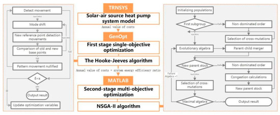 The first of these approaches utilizes renewable energy sources to solve the problem of high energy consumption in traditional settlement energy systems, but a single renewable energy source suffers from poor stability due to factors such as weather and seasonal variations. Therefore, the second method improves on this by using a combination of multiple renewable energy sources to break this limitation, obtaining a higher efficiency, while also needing to consider the configuration optimization of the system. The third approach uses algorithms to optimize the system to obtain the best configuration based on the determination of the optimization objective. None of the above three approaches involves the multi-stage optimization problem for multiple renewable energy sources; on the one hand, the single-objective optimization lacks the consideration of the interaction effects of different parameters, and on the other hand, the multiple objectives are concentrated to be executed in a single optimization process, which is also affected by the range of parameter settings, iteration step length, and number of generations. Therefore, this study proposes a new joint solution based on simulation and multi-stage multi-objective optimization, i.e., on the basis of the building load data and system operating conditions obtained by using the energy simulation software (DeST-h) and the dynamic energy transient simulation program (TRNSYS), the building load data, and system operating conditions are obtained by using the Hooke–Jeeves algorithm, and the Non-dominated Sorting Genetic Algorithm (Archive NSGA-II) is used to perform the two-stage optimization. This study focuses on an optimization structure applied to high-rise residential energy systems, and so high-rise residential buildings located in hot summer and cold winter areas were selected as the research object. The changes of energy consumption, heat, tank temperature, system COP, and collector efficiency of the solar-air source heat pump system in the two optimization phases were discussed, and the results were obtained from areas that include the collector area, collector inclination, collector azimuthal angle, the rated heat production of the air source heat pump, the heat production per unit collector area, and the rated heat production per unit collector area. The optimal design combinations, including collector area, collector inclination angle, collector azimuth angle, air-source heat pump rated heat production capacity, and water tank volume corresponding to unit collector area, are obtained, which improves the economic and energy-saving benefits of the system. The results of the study will provide valuable information for the utilization of solar-air source heat pump heating system in high-rise residential buildings in hot summer and cold winter areas.