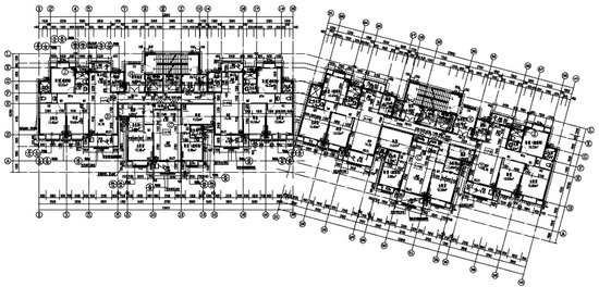 The selected typical settlement was built in 2016. The first floor of the building is residential and commercial, with a single-story height of 5.8 m and a construction area of 1345.91 m2. The second to thirty-second floors are standard residential floors, with a single-story height of 2.9 m and a construction area of 59,583.09 m2. Figure 4 is the construction drawing of the standard floor of this residence.