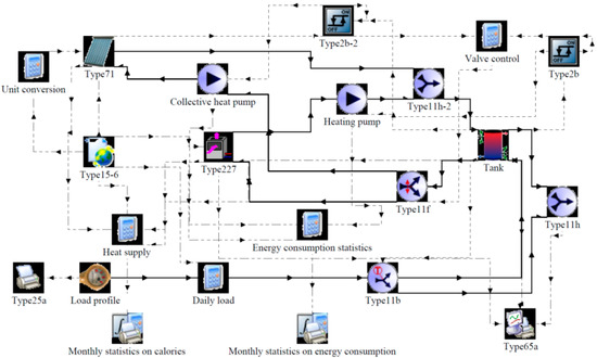 TRNSYS 18 (Transient System Simulation Program) is a software developed by the Solar Energy Laboratory at Wisconsin-Madison University. It can be used to build and simulate energy systems. The most important feature is modularity; each module can realize a specific function. Through the combination of different modules to achieve specific functions and connecting the parameter data to build a simulation model, simulation and analysis of the system can be conducted [61].This study uses TRNSYS to build a solar-air source heat pump system simulation platform (Figure 5).