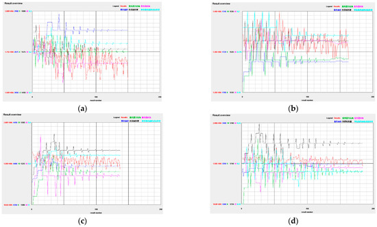 Optimization process variables and objective function trends and results. (a) Chongqing; (b) Wuhan; (c) Nanjing; (d) Shanghai. (Green: collector azimuth; Fuchsia: collector inclination; Blue: collector area; Black: heat pump heat production; Light blue: volume corresponding to unit collector area).