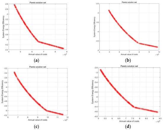 The initial population size of 200, iteration number of 500, crossover ratio of 0.8, and variance probability of 0.05 were set in MATLAB. The program was run to obtain the set of Pareto optimal solutions for each region separately (Figure 6). Use entropy weighting method for weight calculation. The weights occupied by the annual value of the cost and the system energy efficiency ratio in each region are obtained, respectively. Among them, the weight of the annual value of the cost in Wuhan is 45.69%, and the weight of the system energy efficiency ratio is 54.31%. Chongqing has a weight of 49.78% for the annual value of costs and 50.22% for the system energy efficiency ratio. Nanjing has a weighting of 46.35% for the annual value of costs and 53.65% for the system energy efficiency ratio. The weight of the annual value of Shanghai costs is 47.67% and the weight of the system energy efficiency ratio is 52.33%. The TOPSIS method was used to evaluate and rank each solution. Two hundred sets of decision scores were obtained for each region separately (eight hundred sets in total). The Pareto optimal solution for each city is shown in Figure 7. The top three ranked solutions are shown in Table 5, Table 6, Table 7 and Table 8. The solution ranked 1 is taken as the optimal configuration for each region.