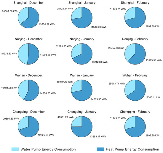 Like the energy consumption of water pumps, the energy consumption of heat pumps also shows a trend of gradual increase and then gradual decrease. In terms of the total energy consumption of heat pumps, Chongqing ranks first, followed by Shanghai, while Nanjing shows a relatively low level of total energy consumption of heat pumps. Overall, heat pumps dominate the energy consumption of each city, with Chongqing having the highest share of heat pumps at 72.09%. Compared with Chongqing, Shanghai, Wuhan, and Nanjing have a lower share of heat pump energy consumption, with 68.85%, 65.82%, and 62.26%, respectively. The specific data is shown in Figure 8.