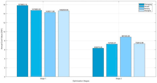 (1) The results of the optimization of the annual values of costs are shown in Figure 9. In the first stage of single-objective optimization, the Hooke–Jeeves algorithm was used to preliminarily optimize the energy system parameters for each city, resulting in fundamental high-quality solutions and providing an initial reference for economic indicators. Key results include slight increases in collector area for all cities, with Nanjing showing the most significant increase (0.46%). Air source heat pump capacities were adjusted, with reductions in Chongqing (0.67%) and Nanjing (4.06%) and a slight increase in Shanghai (0.57%). Heat pump performance in Wuhan remained stable. Adjustments in thermal storage volumes were also noted, with significant reductions in Wuhan (9.26%) and Shanghai (4.09%) and notable increases in Chongqing (11.01%) and Nanjing (19.92%).
