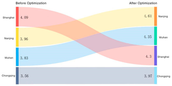 (2) The System Efficiency Ratio Before and After the Second-Stage Optimization is shown in Figure 10. In the second stage of multi-objective optimization, the NSGA-II algorithm was used to enhance energy efficiency while ensuring economic viability. The results revealed distinct optimal solution sets for each city, reflecting their unique energy system requirements. Key adjustments included reductions in collector area by 0.21-18.37% (most notably in Wuhan) and decreases in air source heat pump capacity by 4.91–13.56% in Chongqing, Wuhan, and Shanghai, while Nanjing saw a 34.96% increase. Thermal storage volumes increased by 16.88–57.06%, with Shanghai showing the largest rise. These changes led to a further reduction in annual cost value by 38.29–59.91%. The optimization measures have achieved significant results, with system energy efficiency ratios in Chongqing, Wuhan, Nanjing, and Shanghai improving by 11.52%, 13.58%, 16.29%, and 5.13%, respectively, with the largest increase in the system energy efficiency ratio in Nanjing in particular, which indicates that the city has made the most significant improvements in system energy efficiency.