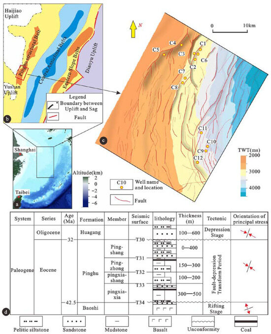 Location of the southern Pinghu structural belt and its stratigraphic development characteristics. (a) Location of the East China Sea Shelf Basin; (b) unit division of the Xihu Sag structure, where the blue and dark blue areas represent the central bulge zone of the Xihu Sag, the orange−yellow and yellow areas depict the slope positions on both wings, the purple area highlights the Diaoyu Island Uplift to the east in disconformable contact with the depression, and the white area indicates the adjacent uplifted structural zone, showcasing the relationship between the sag and surrounding geological structures; (c) distribution of fault systems in the southern Pinghu structural belt, the gradient from orange to blue in the seismic reflection horizon of T30 signifies the increasing depth; (d) comprehensive bar chart of the Pinghu Formation.