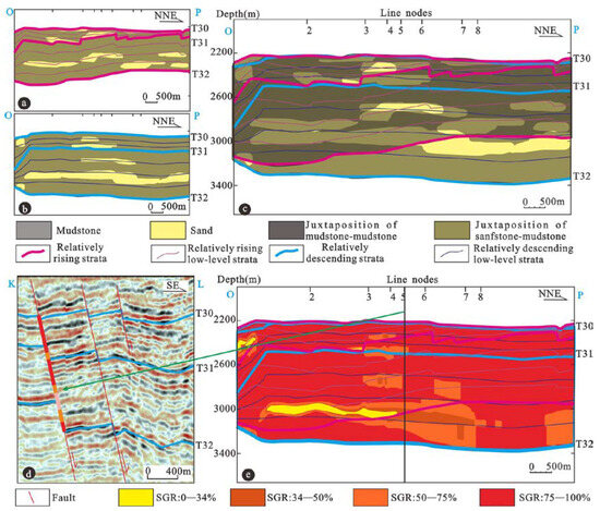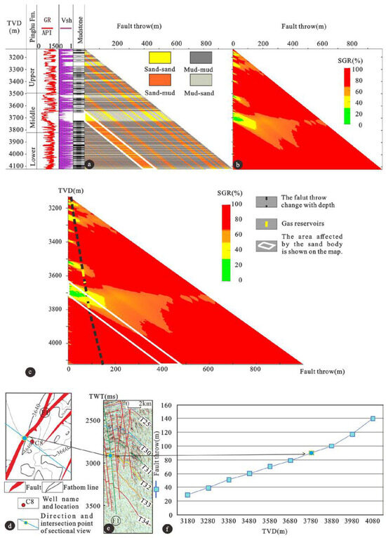 In Figure 2f, the point that descends approximately 3780 m corresponds to one of the points in Figure 2b. This point represents the seismic reflection interface T32, which is a significant reservoir of the study. Assessing SGR using multiple continuous points at varying depths is a crucial function of Figure 2c. Figure 2d–f serve as an example to illustrate the origin of a specific value in Figure 2c, ultimately showing that Figure 2c is a representation of the continuously varying SGR values along the fault’s vertical extent.