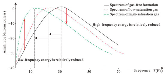 Gas detection using the attenuation method is a subsurface gas detection technology that is based on the principle of seismic P-wave energy attenuation [55,56]. When gas is present in the ground, the reflection exhibits a certain frequency change; that is, the proportion of low-frequency energy is higher, the proportion of high-frequency energy is reduced, and the peak frequency decreases (Figure 3) [56,57]. To accurately detect underground gas layers, three-dimensional seismic data are processed using signal decomposition techniques, such as wavelet transform, and the seismic signal is decomposed into frequencies ranging from 5–30 Hz. Outliers indicating attenuation can be computed using the difference between a frequency and a size-adjacent decomposition frequency. These attenuation values are reflected both horizontally and vertically, and further superposition with structural maps will provide better indications. We employed the generalized low-frequency shadow hydrocarbon detection technique to predict potential gas reservoirs in deep, unwelled areas, focusing on the characteristic changes in the main frequency of seismic bodies. As seismic waves propagate through layers with varying rock properties and fluid contents, they experience different degrees of attenuation. When seismic waves pass through gas-bearing strata, they typically cause a relative reduction in the energy of high-frequency components and a relative increase in the energy of low-frequency components in the seismic spectrum, resulting in a lower main frequency. The three different curves represent the waveforms of different frequencies of the seismic body, where a higher main frequency indicates poorer gas-bearing strata, and a lower main frequency indicates better gas-bearing strata (Figure 3). The reason for the continuous decline in curve values beyond the main frequency is the attenuation of seismic wave energy on both sides of the main frequency. This method can be used to effectively detect abnormal gases underground and provides reliable technical support for hydrocarbon detection [58].