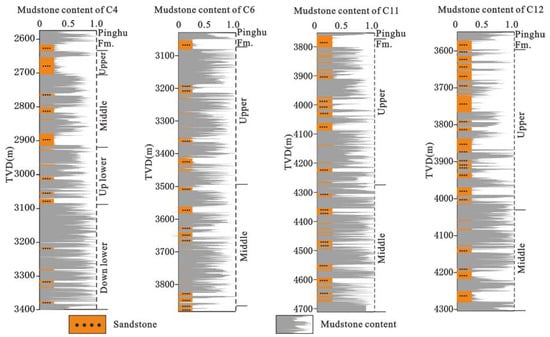 The Pinghu structural belt is located in the middle of the western slope of the Xihu Sag (Figure 1b). The Pinghu Formation in the study area is Eocene in age and mainly contains sandstone and mudstone mixed with coal seams. The Pinghu Formation is in a transitional environment between sea and land and can be divided into four parts:the Pingshang Member, the Pingzhong Member, the Pingxiashang Member, and the Pingxiaxia Member (Figure 1d). The sediments located in the lower part of the Pinghu Formation was deposited during the water invasion period, and the strata were mainly composed of a large set of mudstones interbedded with sandstone, while the sediments located in the upper part of the Pinghu Formation was deposited during the water regression period, and the strata consisted mainly of interbedded deposits of sandstone and mudstone, which were deposited in the transitional stage of evolution [46,47,48,49,50]. From the top to the bottom of the Pinghu Formation, the proportion of mudstone in the formation increased.