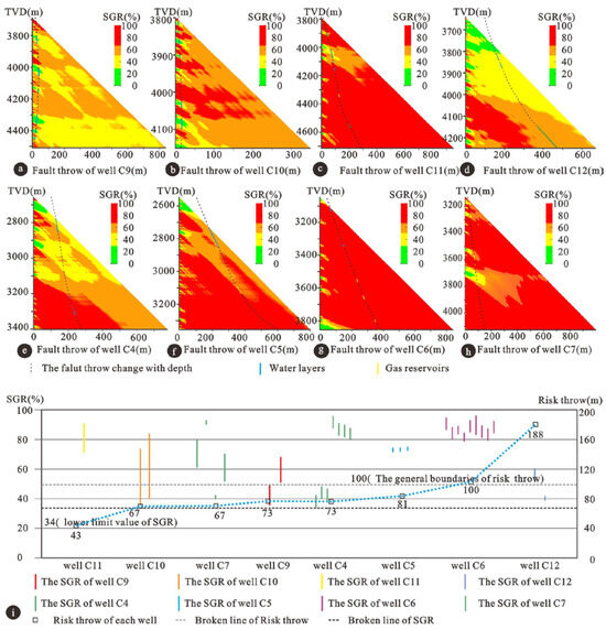 Numerical display of fault closure in the southern Pinghu structural belt. (a–h) SGR value constrained by well location in the study area; (i) comparison diagrams of risk throw and sgr threshold at different well locations.