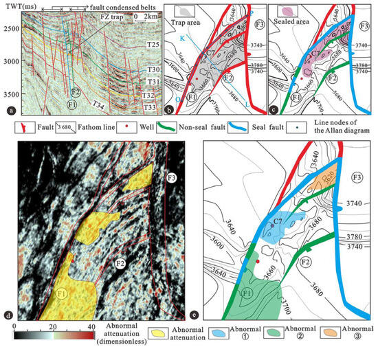 Compared to those in located enclosed areas, traps bounded by fault-extinguishing sections are completely ineffective and serve only as pathways for hydrocarbon migration [53]. For example, in the C7 well area, the SGR value of the middle section of the F1 fault is close to the sealing threshold, and some layers are locally controlled by the fault (Figure 6, Figure 7c, and Figure 8b). In the C10 and C12 wells in the southern part of the study area, the T32 interface fault is fully opened, and the hydrocarbon reserves are poor (Figure 8a,b, Table 1). The trap boundaries for these open fault traps are usually formed by the ends of the faults (Figure 1c and Figure 8b).