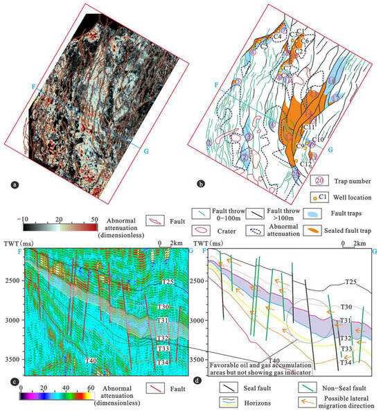 Although faults in high SGR areas have strong sealing properties, due to certain geological conditions (such as mudstone and sandstone distribution and tectonic activity), these areas may not have formed effective hydrocarbon accumulations, leading to trap failure. For example, although they were completely enclosed, the fault block traps on the east side (numbers 12, 13, and 14) failed to form gas layers (Table 1, Figure 8a,c). This may be due to the well-sealed faults that developed on both sides of the area (Figure 8b,d), which seal not only the control trap faults but also the hydrocarbon source fault [78]. Continuously closed faults can hinder the lateral migration of hydrocarbons and affect the potential for hydrocarbon accumulation in traps. These unfavorable traps can be identified by using the advantage of the gas detection method (Figure 8).
