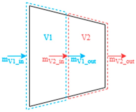 Compared with the volume dynamic method, the variable mass method establishes control volumes at the selected component inlet and outlet, calculating the component pressure ratio through the imbalance between mass and temperature. The selected control volume consists of four rotating components. The variable mass equations are used in the inlet and outlet, respectively, taking a low-pressure compressor (LPC) as an example (Figure 2). It should be noted that the volume is bigger than , otherwise the calculation will not converge.