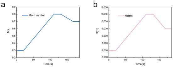 Mission profile of the aircraft: (a) Mach number, (b) Height.