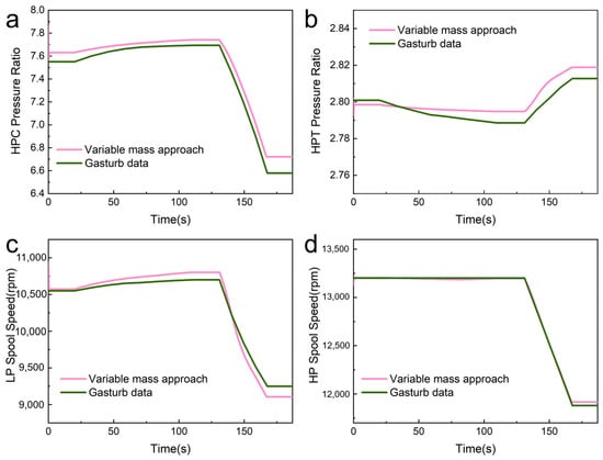 From Figure 4 and Figure 5, it can be observed that under the conditions of aircraft climb, cruise, and deceleration, except for some points with an error of about 2% in deceleration, the error of all other data is within 1% and the trend of change is consistent. Considering the possible differences in engine bleed, geometric structure, etc., the authors believe that these errors are within an acceptable range and it can be considered that the dynamic simulation of the variable mass approach is accurate.