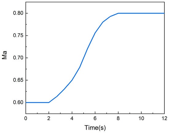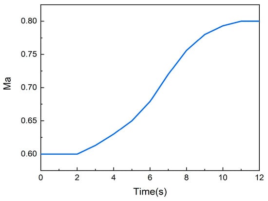 To compare the differences between the variable mass method and the volume dynamic method, two methods were used to simulate two extremely rapid acceleration processes. The design point parameters of the aircraft are shown in Table 1. The flight altitude is 11,000 m, and the Mach number variation of the two processes is shown in Figure 6 and Figure 7, with the high-pressure axis maintaining maximum speed. The first acceleration process lasts for 9 s and the second for 6 s.