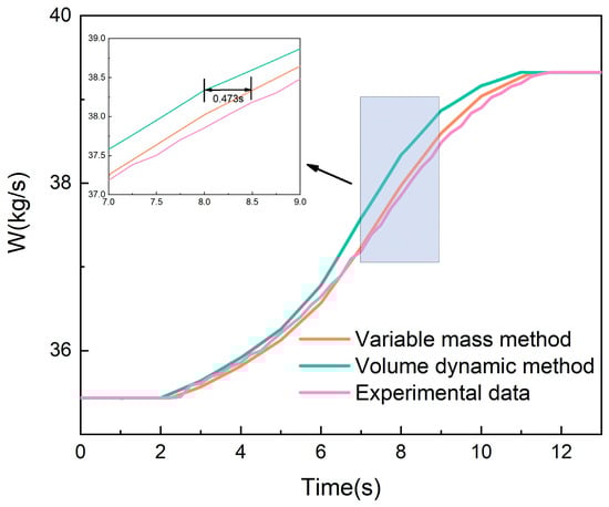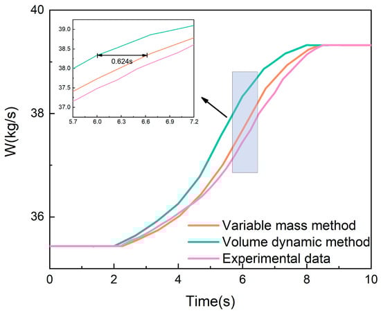 As can be seen from the figure, compared with the volume dynamic method, the variable mass method has a certain degree of delay in the change of the outlet flow rate of the high-pressure compressor. This result is closer to the experimental results, and the average error of this process has been reduced by 68.3%. During this acceleration process, the maximum time delay reached 0.473 s, accounting for 5.26% of the acceleration process (lasts for 9 s).