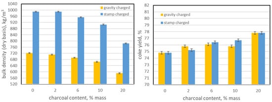 - The addition of biochar in amounts up to 20% (wt.%) caused a decrease in the bulk density of the coking charge.