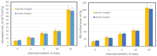To assess the micropore volume and surface area, CO2 sorption method was used. The range of estimated volume and surface area of the micropores was 6.2–49.4 × 10−4 cm3/g and 14.4–106.1 m2/g, respectively. It is clearly visible that the addition of charcoal caused a significant increase in the volume of micropores in bio-coke, which is associated with the increase in their summary surface area (Figure 3). There were no significant differences between the method of loading the retort both for the gravity and stamp charging system and for the specific content of charcoal; values within the expanded uncertainty. However, it should be noted that the increase in the value of both parameters is tremendous. Already for the 10% of the charcoal addition, the values of determined parameters were more than twice as large, while for 20% of the value they were five times higher. An even higher increase in specific surface area was noted in work [59] where a 20% addition of yellow poplar caused more than 13 times increase (bio-coke produced in 700 °C). This indicates a very developed charcoal microporosity concerning the microporosity of a coke substance derived from the resolidified coal plastic mass. An increase in surface area measured with N2 and CO2 was also observed by Flores et al. [24]. In the case of CO2, the values obtained were several times lower than in the case of our study. Kieush et al. [29] also observed some increase in BET surface (measured by N2 sorption) with the addition of 5% wood pellets. The differences in the obtained surface area results most likely stemmed from the use of a different type of charcoals and a different type of coal mixture, whose properties and behavior during the pyrolysis process determine the unique nature of the microstructure of coke or bio-coke. As a rule, the charcoal’s surface area and micropore volume is much larger than other reductants of fossil origin, including coke [24,60,61]. In addition, the structure of the micropores could be additionally developed (increased) during the co-pyrolysis process because the final temperature of the production of the classic charcoal (used in our study) is within 500–550 °C, while during the co-pyrolysis process, the final temperature of the bio-coke production was 950 °C. The literature reports indicate that with the increase in the final temperature of pyrolysis, the surface area of the chars produced also increases [62], which suggests that the charcoal used, which initially had a much higher surface area, developed it even further during the pyrolysis process. The increased micropore surface increases the accessibility of the bio-coke matrix for CO2 molecules during the gasification reaction (Boudouard reaction), which may suggest that bio-cokes produced will be characterized by increased reactivity compared to coke produced from the reference blend. Generally, the results in the form of surface area growth along with the addition of biomass substances follows the literature reports [26,61].