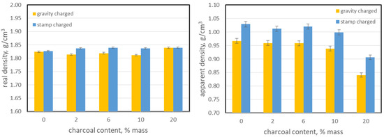 Figure 4 shows the influence of the addition of charcoal on the real and apparent density of particles of the bio-coke produced. In general, the range of determined true densities was in a relatively narrow range from 1.811 to 1.839 g/cm3. For bio-coke produced from feedstocks with a higher density (stamp charged), a slightly higher real density was observed for the share of 2, 6 and 10% charcoal addition, but despite the fact that the differences go beyond the uncertainty range, they are very small and should not be of great importance from the technological point of view. Theoretically, taking into account the values of real densities for coal and charcoal (Table 1), it would be expected that the addition of charcoal should increase the real density of bio-coke due to the fact that it is characterized by a noticeably higher real density than the coal blend. However, it must be taken into account that the coal structure during the pyrolysis process from the ambient temperature to the temperature of about 950 °C undergoes a strong transformation (polymerization, condensation, and cyclization reactions), which means that the true density of the carbon matrix also increases, as evidenced by the values of the true density of cokes with no added charcoal. These values are significantly higher than the value obtained for the raw coal blend. Obviously, the real density of charcoal introduced into the coal blend is also increased because of temperature, which is confirmed by the literature reports [63]. However, despite the undoubted increase in the real density of both raw materials (during the pyrolysis process), the final real density of bio-coke is at a similar level for all produced bio-cokes (regardless of the charcoal content), it means that the post-pyrolytic residues of both raw materials, together forming a conglomerate bio-coke, have a similar real density.
