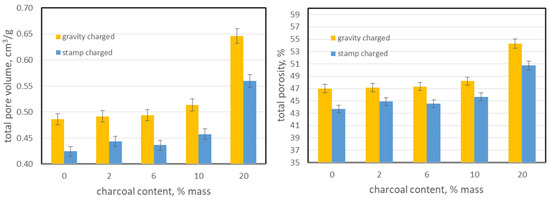 Influence of charcoal addition on total pore volume and total porosity of bio-cokes.