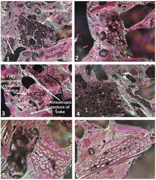 An interesting thing was observed in the case of the effect of charcoal addition on the total pore volume and total porosity of the obtained bio-cokes. Considering the significantly higher total pore volume of charcoal (1.510 cm3/g—Table 1) in relation to the total pore volume of coke produced from the coal blend without the charcoal addition (0.425–0.486 cm3/g—data in Figure 5) and significantly higher porosity (69.4% for charcoal; 44–47% for pure coke), it was expected that the addition of charcoal with a much higher total pore volume and porosity would cause a significant increase in both parameters. Meanwhile, although a slight trend can be seen, the increase in both parameters is relatively small in up to 10% of the supplement. Only for the content level of 20% can a big difference be observed. Considering the significantly lower apparent density of charcoal (0.460 g/cm3—Table 1) compared to the density of coke produced from the charge mixture without the addition (0.96–1.04 g/cm3—data in Figure 6) and significantly higher porosity (69.4% for charcoal; 44–47% for pure coke), it was expected that the addition of charcoal would cause a significant increase in both parameters. Obviously, one should also take into account a certain increase in porosity and thus total pore volume along with an increase of carbonization temperature. According to the literature reports, an increase in the carbonization temperature causes an increase in the porosity of charcoal [64,65]. The aforementioned increase in the porosity of charcoal should increase the effect of increasing the porosity of bio-coke with the addition of charcoal. However, in up to a 10% addition of charcoal, an increase in porosity of only about 1.2–2 percentage points was observed. A greater increase in porosity should also be caused by a decrease in the bulk density of the charges (in particular for gravity charging charges) because as it is known, the decrease in the bulk density of the coking charge is associated with an increase in the porosity of the coke produced [34]. In the case of our research, such a small change in porosity observed in up to 10% of the charcoal content is caused by the penetration of the plastic mass coming from the coal part, the charcoal porous structure. This is very visible in the optical microscope images in polarized, reflected light (Figure 6). The plastic mass during the coal’s transition through the plastic state in a specific temperature range (approx. 350–500 °C) flows inside the charcoal structure, thus impregnating some of the pores, which consequently causes their closure (Figure 6). In Figure 6, it can also be observed that some charcoal particles are more (Pictures no. 3, 4, 6) and some less impregnated (Pictures no. 1, 2, 4) by the surrounding, penetrating, and consequently solidified plastic mass. This is most likely due to several factors such as the size of the particles, the morphology of their pores, their arrangement in relation to the moving plastic mass, as well as the rheological properties (fluidity) of the plastic mass itself.
