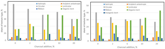 Figure 7 shows the influence of charcoal content on the types of optical textures occurring in bio-coke for gravity charging (left) and stamp-charging bio-cokes (right). Obviously, the addition of charcoal caused an increase in organic inerts, because generally this type of addition behaves inertly during the transition of carbon to the plastic state and in the microscopic image it constitutes an organic inert clearly distinguishable from other textures. Moreover, a decrease in circular textures was also observed. In the case of bio-cokes from the gravity charging system, there are slightly more circular textures than from stamp charging bio-cokes. The content of other types of textures does not show any clear trends.