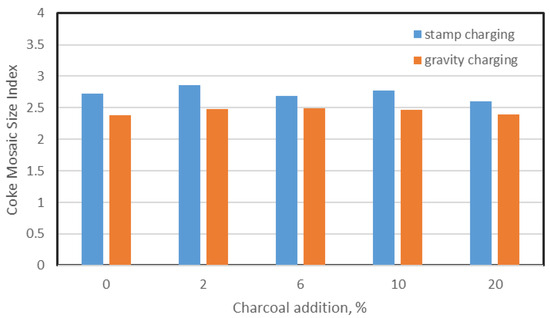 To illustrate the impact of the addition of charcoal on the conditions of texture formation, the CMSI (Coke Mosaic Size Index) was used to describe the coke texture using one indicator, which greatly facilitates the interpretation of the results (Figure 8). However, it should be remembered that the use of this indicator applies only to the so-called binder phase, i.e., coke textures formed from plasticizing macerals of coking coal. On the other hand, it allows us to assess how the significantly reduced fluidity of the coking blend (due to the addition of charcoal [14]) influenced the final degree of ordering of the bio-coke matrix. Interestingly, the addition of charcoal did not significantly affect the CMSI value, which allows us to assume that in the examined case, the reduction in the fluidity of the plastic mass as a result of the use of charcoal addition (Fmax decreased from 699 ddpm to 30 ddpm for 20% addition [14]) did not significantly worsen the conditions for creating the bio-coke texture. The only thing that can be observed is slightly higher CMSI values for bio-cokes from the stamp-charged feeds, which confirms the positive effect of increased charge density (and higher pressure in the plastic layer) on the degree of texture order. This leads to the conclusion that the addition of charcoal may have primarily a physical effect. It reduces the fluidity of the sample mass as a mixture of coking coal and charcoal, but most likely the coking coal part itself may have sufficient high fluidity for the texture to become well organized. There may be some reduction in fluidity due to the sorption of the plastic mass components by the porous structure of the inert additive or increased friction forces on the stirrer from unplasticized charcoal particles, but the final fluidity is sufficient and, as previously mentioned, it does not significantly worsen the conditions for texture organization (up to 20% addition).