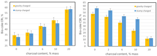 The results of the impact of charcoal addition on the value of CRI and CSR indices are presented in Figure 9. It is clearly visible that the addition of charcoal significantly affects the value of both parameters. For the charge in the case of CRI, it was observed the increase in value from 34.6 (pure coke without additive) to 58.1% for 20% charcoal addition. We can observe that the use of a higher charge density (stamp charged) did not significantly affect the value of the achieved parameters. For 20% of the additive, the CRI increased from 33.0 to 58.4%. The observed trends, both for CRI and CSR, are consistent with the literature reports. An increase in reactivity (according to CRI or other methods) and decrease in CSR with the addition of charcoal was observed in works [11,15,16,17,20,26,32]. In the paper of Solar et al. [12], no significant changes in reactivity were noted, but the share of charcoal in the charge mixture intended to produce bio-coke was only 2% and the alkalinity index of the added charcoal was lower than those of coking blend. Similar trends were also observed when adding raw biomass—not thermally processed [19,28,29,31]. Higher values of the bio-coke reactivity index may be caused by several factors. First, as previously mentioned, the texture of the coke produced from the coals is ordered during the plastic state to form highly ordered textures that are low in reactivity. In the case of the addition of charcoal, we are dealing with the introduction of a carbon material with an isotropic texture of a low level of ordering. This was confirmed by assessing the optical textures in the produced bio-cokes (Figure 7), where an increase in the content of organic inerts was found. The increase in organic inerts was simultaneously accompanied by a decrease in anisotropic textures (less reactive), which also contributed to the increase in the reactivity of bio-coke. The isotropic textures, including organic inerts, are much more reactive, so an increase in their share results in a gradual increase in the reactivity of the composite bio-coke. Moreover, changes in structural parameters, including total porosity and micropore surface, also contributed to the increase in reactivity. The significantly higher micropore surface area observed with the increase in the amount of charcoal added (Figure 3) results in a much larger contact surface available for CO2 molecules, which intensifies the gasification reaction. The aforementioned increase in total porosity and total pore volume also contributes to the increase in reactivity. Greater pore volume and porosity also mean more paths for CO2 molecules to penetrate the bio-coke structure consecutively. In addition to the aforementioned factors, an additional factor increasing the reactivity could be the increase in the content of alkaline compounds of the mineral substance, which is confirmed by the chemical composition of the ash and the increase in the value of the AI (Table 1). It is a well-known and proven fact that alkaline components act catalytically in Boudouard reactions [70,72,73]. In the case studied, we can observe that the introduced charcoal contained significant amounts of calcium and potassium. The influence of increased alkali content on the reactivity of bio-coke was also suggested by [11,15,16,26].